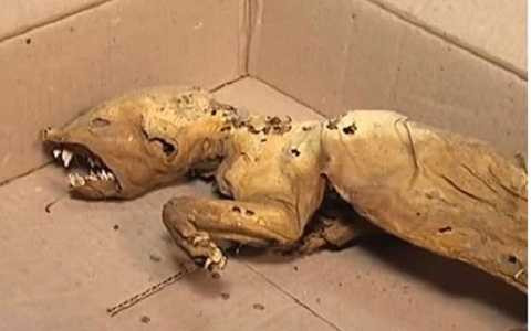 Theo kênh TSN của Ukraina, xác ướp sinh vật kỳ quái có 4 chân, có đuôi dài, mắt hình bầu dục và vẫn còn nhiều răng.