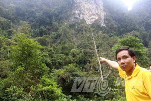 Anh Ma Văn Nghị chỉ lên quả núi dựng đứng án ngữ trước mặt, phô ra vách đá trắng phau. Trên vách đá ấy, có một miệng hang đen ngòm. Nhìn tinh mắt, thấy những chiếc thang tre buộc ròng vào nhau dài cả trăm mét vắt vẻo trên vách đá.