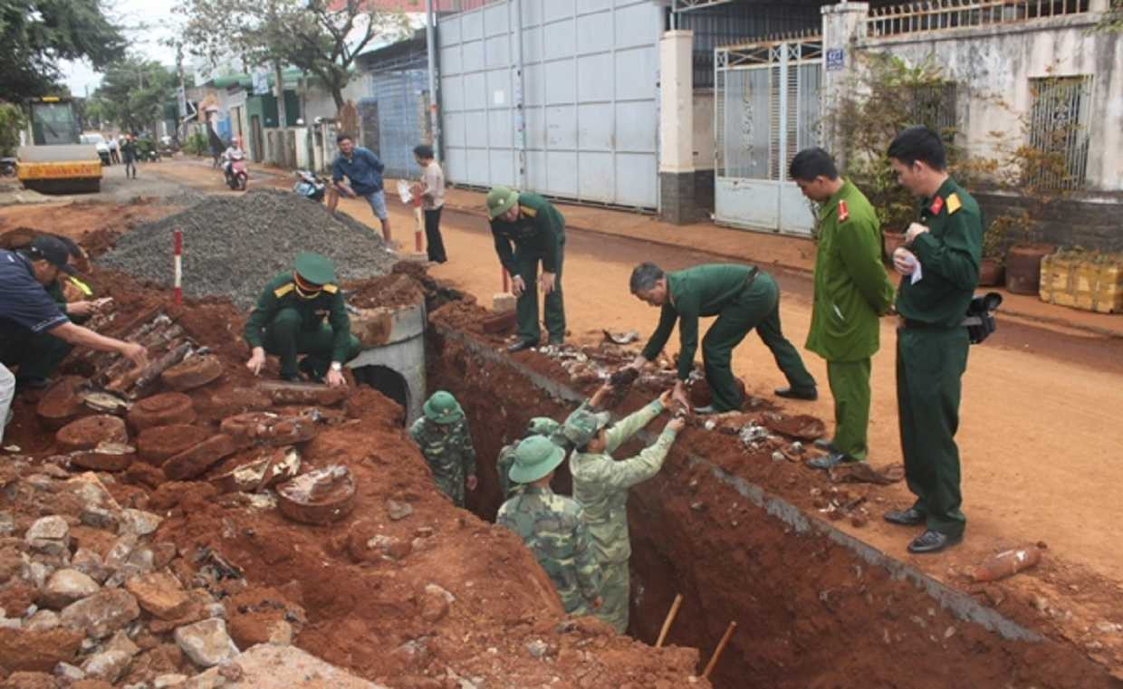 Trước đó, công nhân của công ty xây dựng Hoàng Nam đang thi công hệ thống cống thoát nước thải trên đường Quang Trung (thuộc phường Tân Tiến, TP.Buôn Ma Thuột), phát hiện có một hầm chứa rất nhiều loại đạn pháo, vật liệu nổ dưới độ sâu 1,4m.
