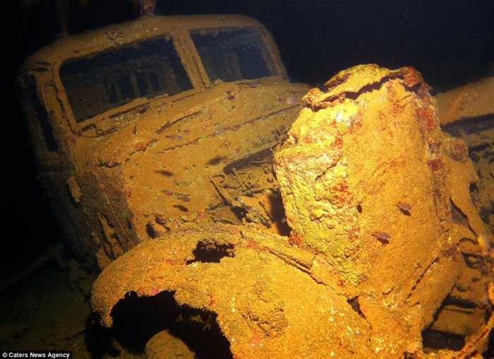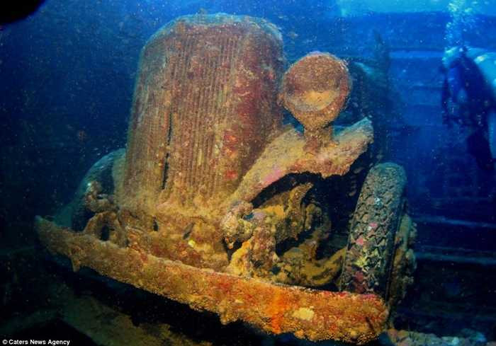 Một chiếc xe nằm trong tàu gần như còn nguyên vẹn sau khi bị đắm
