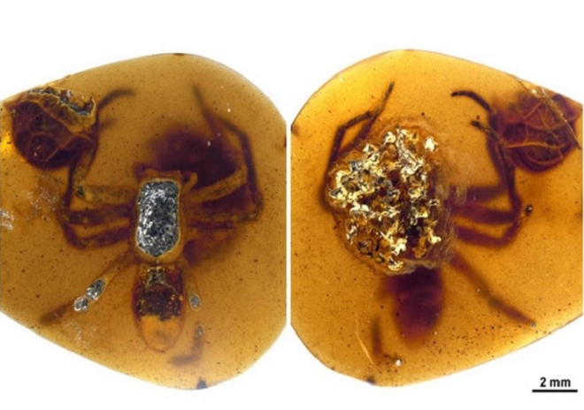 Bên trong hóa thạch là nhện mẹ dường như đang bảo vệ bọc trứng chứa đàn con non mới nở. Theo nhóm nghiên cứu, có vẻ như mẹ con nhện đang chăm nhau thì bị mắc kẹt trong nhựa cây.
