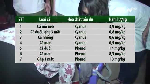 Kết quả kiểm nghiệm 9 mẫu cá và ghẹ lấy tại Hà Tĩnh do Viện Kiểm nghiệm ATVSTP Quốc gia báo cáo cho thấy nhiều mẫu có hàm lượng xyanua, phenol và cadimi vượt ngưỡng cho phép.