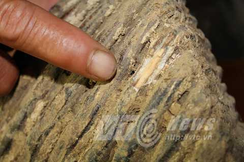 | Dấu vết xương hóa thạch lộ rõ khi ông Minh đập đi một góc |