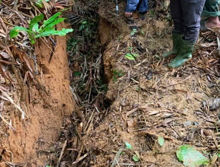 Theo đó, ngày 19/9, người dân phát hiện các vết nứt sâu 1,3m-5m với chiều dài hơn 120m trên ngọn đồi phía sau khu dân cư. Một số điểm có dấu hiệu bị sạt, lún sâu. Toàn bộ vị trí này theo đánh giá sơ bộ đã bị ngấm nước và có nguy cơ sạt trượt bất cứ lúc nào.