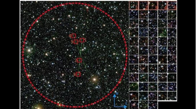 Nằm cách Trái đất khoảng 3 tỷ năm ánh sáng, một trong những cấu trúc nổi bật nhất của vùng vũ trụ này là một cụm thiên hà khổng lồ được thu hút lại với nhau bởi một thứ gì đó ở trung tâm. Có ít nhất 58 thiên hà tập hợp dày đặc trong cụm.