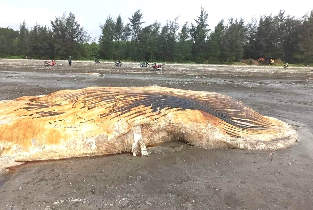 Tại hiện trường, xác cá voi có màu nâu và trắng, một số điểm có sọc đen. Phần dạt vào bờ biển là thân và vây dưới, dài 6-7m, đường kính giữa thân khoảng 4m, nặng hơn 3 tấn. Xác cá voi đang phân hủy nên bốc mùi hôi thối, xung quanh có nhiều loài nhuyễn thể.