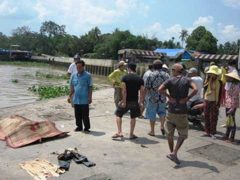 Nam thanh niên mặc áo sơ mi vàng, quần jean xanh, tư thế nằm sấp đang trôi trên sông Tiền dạt vào cồn Tân Long. Sau đó người dân nhanh chóng trình báo cơ quan chức năng.