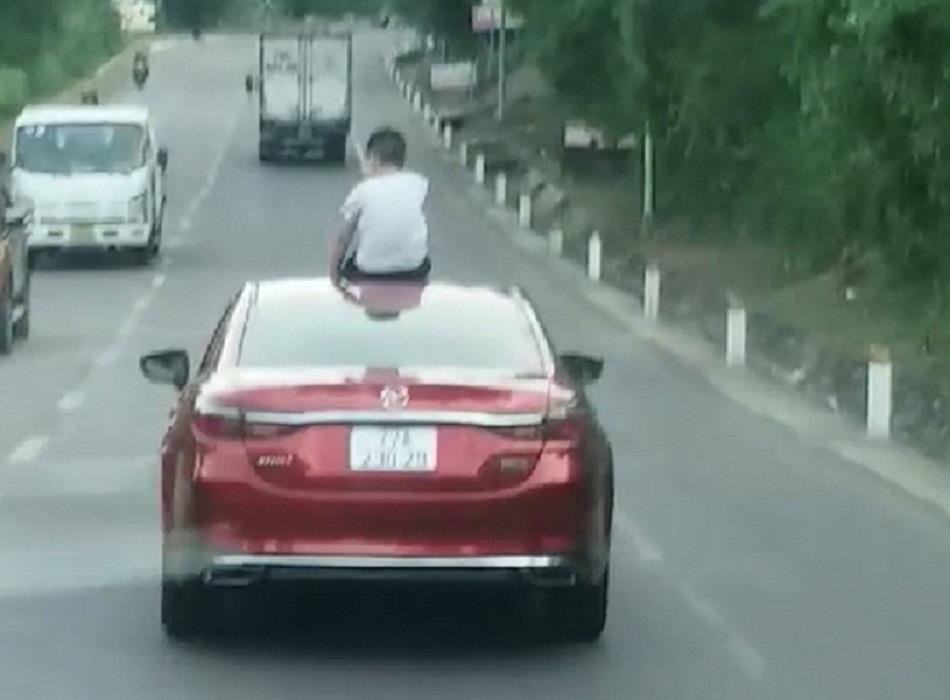 Nữ tài xế V.T.T.P. để con trai ngồi trên mui xe trong lúc điều khiển ô tô.