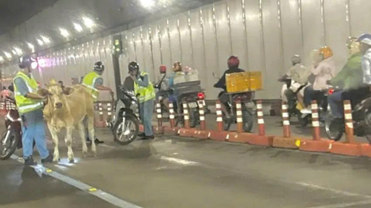 Nhiều tài xế ô tô di chuyển qua hầm sông Sài Gòn hoảng hốt khi thấy chú bò lạc giữa đường hầm, lập tức giảm tốc độ để tránh va chạm.