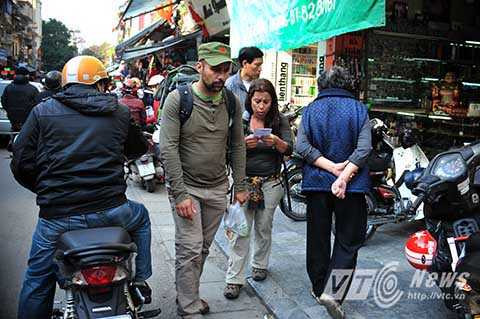 | Du khách nước ngoài không tìm lấy lối đi bộ trên vỉa hè ở phố Cổ Hà Nội |