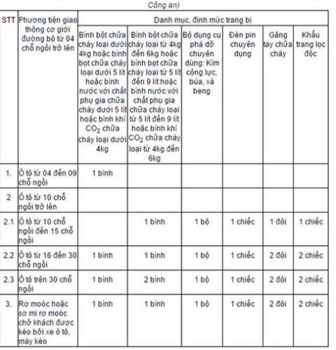 | Danh mục định mức trang bị dụng cụ phòng cháy chữa cháy đối với từng loại phương tiện cơ giới |