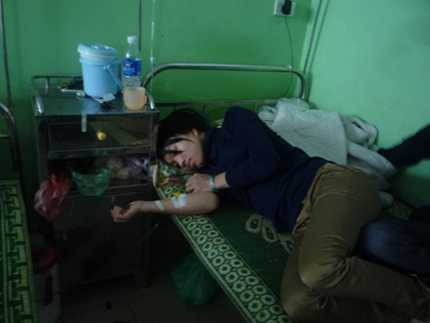 | Chị Lê Thị Phương nằm viện điều trị sau khi bị đổ keo 502 vào tay |