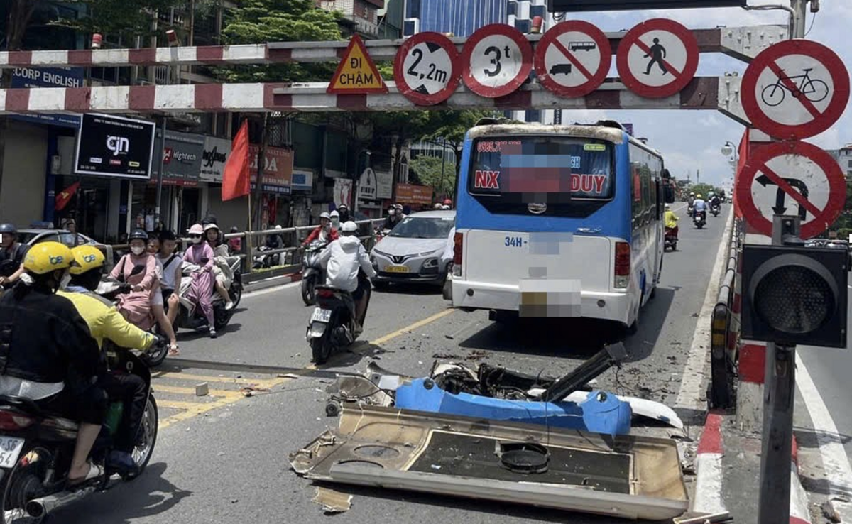 Xe khách đi lên cầu vượt Tây Sơn - Thái Hà làm hư hại biển báo.