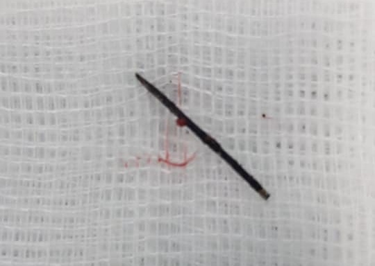 Ca phẫu thuật diễn ra trong một tiếng. Các bác sĩ lấy ra khỏi cơ thể bệnh nhi dị vật là 1/2 chiếc kim khâu dài 17mm đã bị gỉ đen.