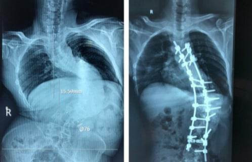 Các bác sĩ quyết tâm phẫu thuật cho bệnh nhân với 2 thì mổ. Thì thứ nhất đi lối trước, cắt xương sườn, vén phổi, cắt tối đa được 4 đĩa đệm để làm lỏng cột sống, sau đó lắp khung Halo kéo dãn trên giường nghiêng 30 độ. Trong 3 tuần, với cân nặng tăng dần đến lúc đạt mức tối đa là 50% cân nặng của bệnh nhân. Thì thứ 2, đi lối sau, bắt vít nắn chỉnh vẹo.