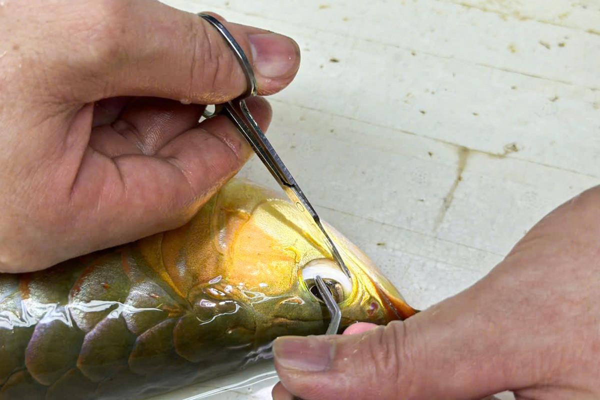 Khi cá ngấm thuốc mê, anh Nam nhẹ nhàng cho ra khỏi bể, đặt lên bàn mổ. Đầu đội đèn pin, tay thận trọng vạch mắt cá, anh Nam bắt đầu cắt mỡ thừa trong hốc mắt cá. Quá trình chỉ diễn ra trong 5 phút, đòi hỏi độ chính xác, vì nếu cắt xệ quá sâu, cá sẽ bị mù vĩnh viễn. Khi bị xệ mắt, cá đớp mồi không chuẩn, bơi nghiêng.