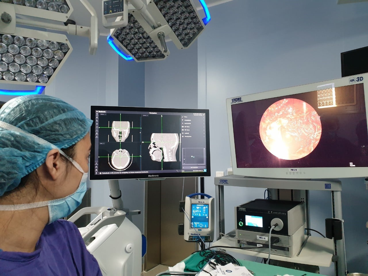 Bác sĩ phẫu thuật nội soi mũi xoang kết hợp định vị lấy khối u cho bệnh nhân.