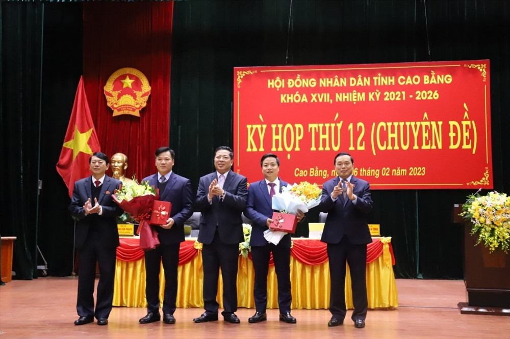 Lãnh đạo tỉnh Cao Bằng chúc mừng ông Trịnh Trường Huy (thứ hai, từ trái sang) được bầu giữ chức Phó Chủ tịch UBND tỉnh Cao Bằng, ngày 6/2/2023. (Ảnh: Chu Hiệu/TTXVN)