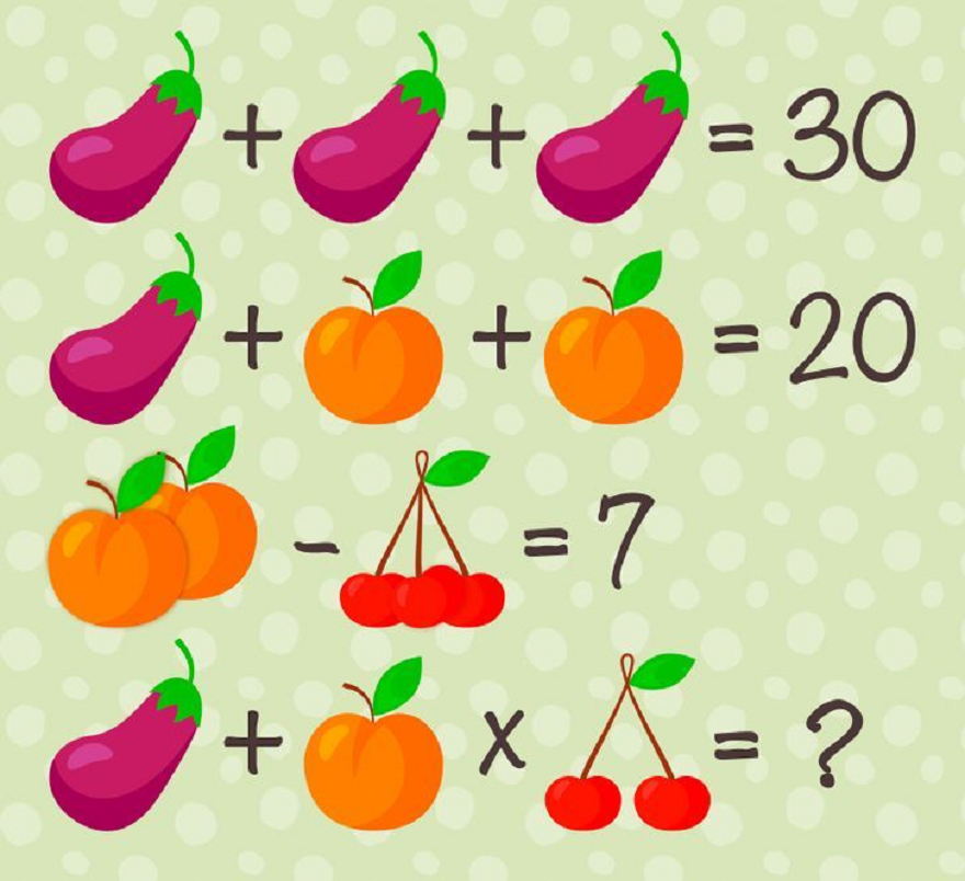Thông qua các phép tính gợi ý, liệu bạn có tìm được giá trị số của mỗi loại quả, từ đó điền kết quả vào dấu hỏi chấm trong một phút?