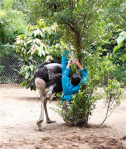 Hà Thu cũng ko ngoại lệ khi lần đầu cưỡi đà điểu
