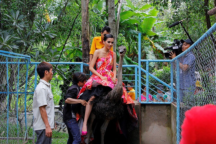 Không ít người đẹp vô cùng sợ hãi khi lần đầu tiên cưỡi đà điểu, những chàng trai cũng gặp không ít trở ngại với những chú đà điểu lì lợm, đã có không ít thí sinh bị té đau.