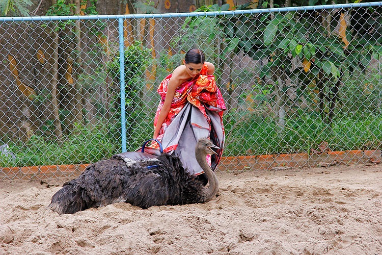 (VTC News) - Các người đẹp ngã dúi dụi và rất đau đớn khi thử cưỡi đà điểu để chụp hình.
