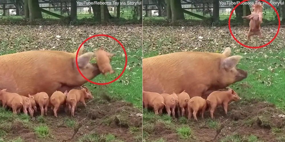 Lợn mẹ đột nhiên nổi đóa dùng mũi hất tung lợn con lên trên cao khiến người xem không nhịn được cười.