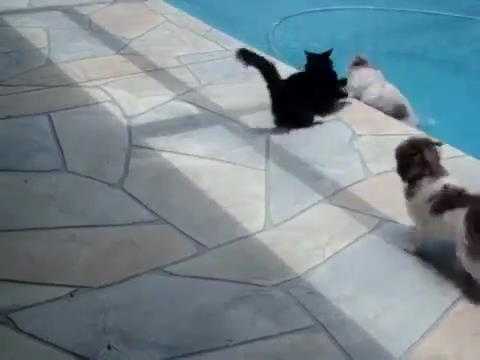 Con mèo đang nằm yên lành thì hai con chó đi loanh 'trêu ngươi' khiến nó nổi điên ra đòn đánh chó ngã xuống bể bơi rồi tháo chạy.