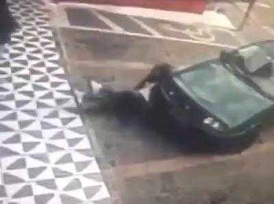 Cô gái vô tư ngồi xuống đầu xe ô tô nhưng không ngờ nó lại lùi ngay sau đó.