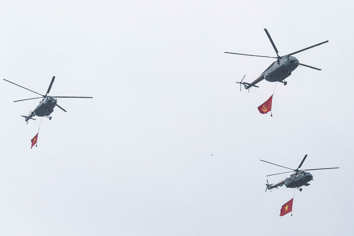 Để có thể mang theo Quốc kỳ và cờ Đảng, những chiếc trực thăng sẽ được treo dưới bụng một quả nặng có trọng lượng 120kg.