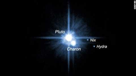 Bốn chấm sáng khác là các mặt trăng nhỏ hơn được phát hiện trước đó, lần lượt vào các năm 2005, 2011 và 2012, được đặt tên lần lượt là Nix, Hydra, Kerberos và Styx.Năm mặt trăng của sao Diêm Vương được biết đến là: Charon, Nix, Hydra, Kerberos và Styx. Một điểm màu trắng hướng mũi tên là sao Diêm Vương.