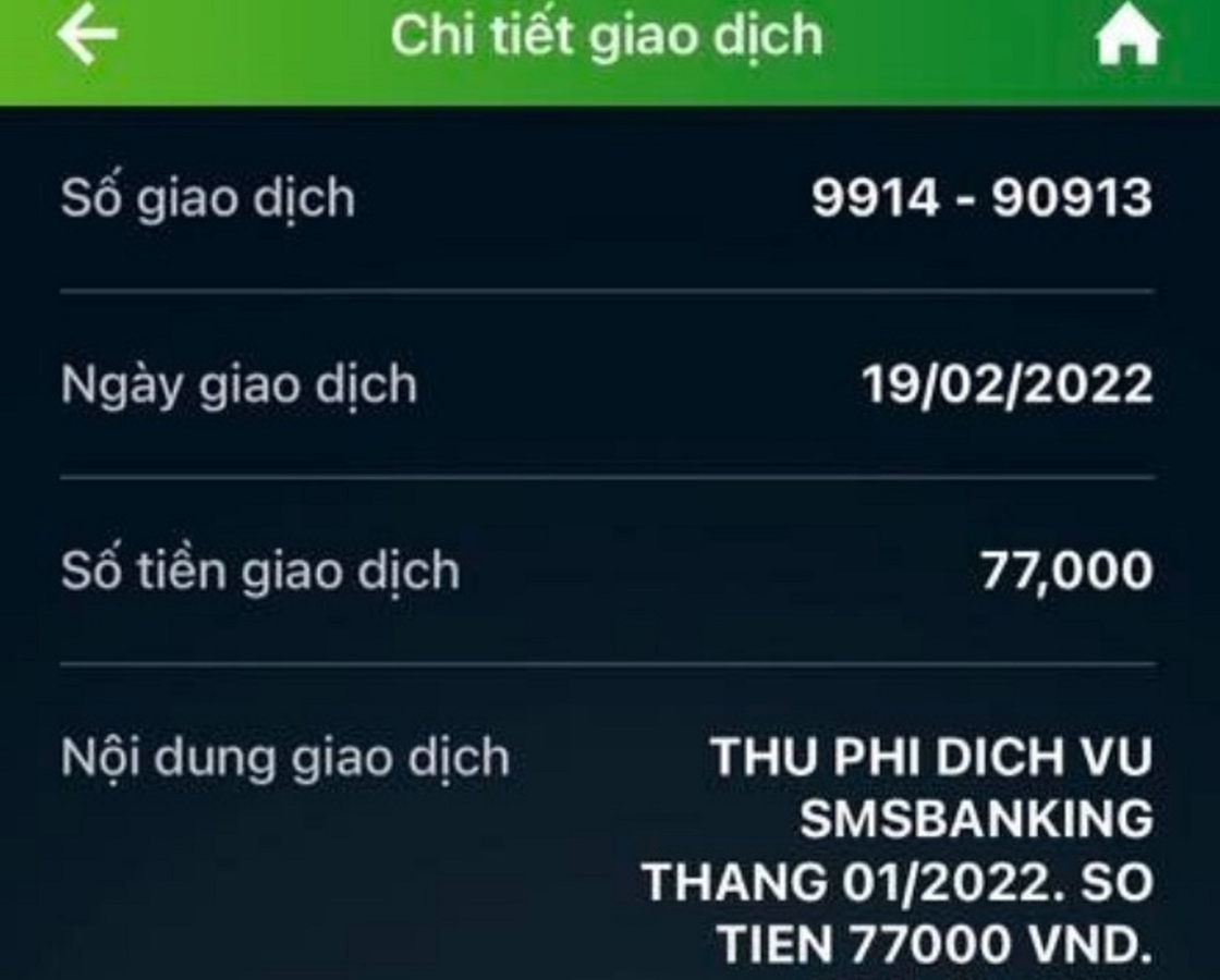 Chị Tạ Thị Vân (Nam Dư, Hoàng Mai, Hà Nội) chiều 19/2 nhận được thông báo thu phí dịch vụ SMS Banking tự động của Vietcombank tháng 1 với mức phí 77.000 đồng. Liên hệ với tổng đài của Ngân hàng Vietcombank, chị Vân được biết đây là chính sách thu phí mới đã được ngân hàng thông báo thay đổi từ cuối năm 2021.