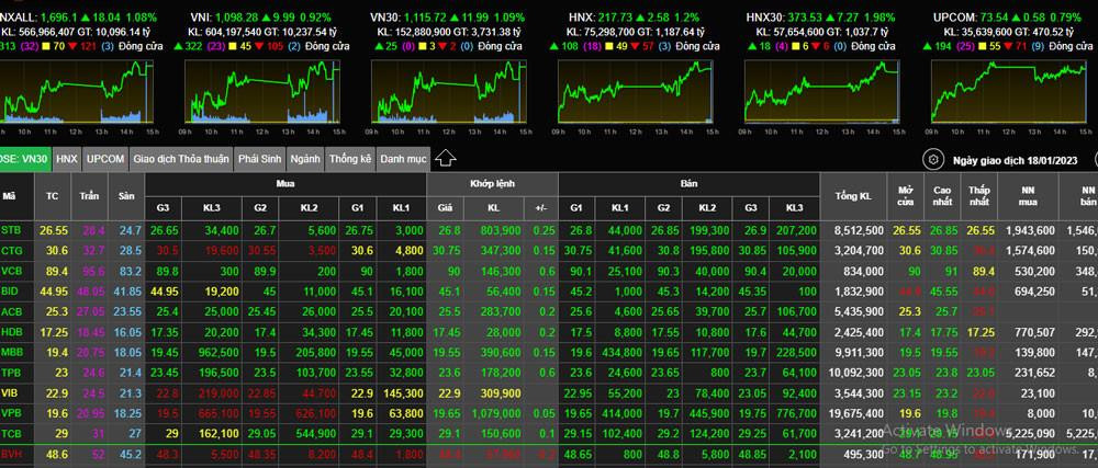 Kết thúc phiên giao dịch 18/1 (27 tháng Chạp), chỉ số VN-Index tăng 9,99 điểm (+0,92%) lên 1.098,28 điểm. HNX-Index tăng 2,58 điểm lên 217,73 điểm. Upcom-Index tăng 0,58 điểm lên 73,54 điểm.