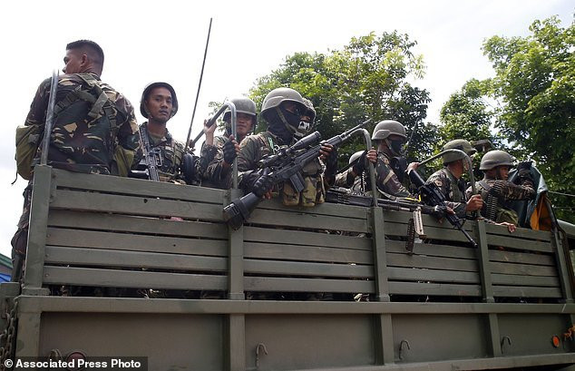 Xe tăng quân đội chở theo binh sĩ tiến vào thành phố Marawi, trong bối cảnh đụng độ giữa hai bên xảy ra liên tiếp.