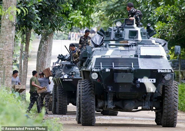 Binh lính chuyển đạn dược và đồ ứng cứu lên đoàn xe bọc thép chở quân hướng về Marawi.
