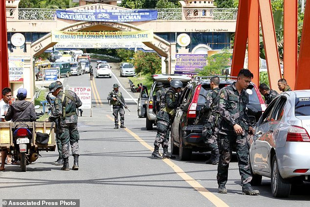 Quân đội chính phủ thực hiện nhiệm vụ tại trạm kiểm soát trên đường cao tốc hướng về Marawi ngày 25/5.