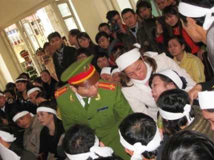 Đúng 13h30 phút, Lê Văn Luyện và các bị cáo được áp tải đến toà án để tiếp tục xét xử, 20 phút sau đó, gia đình nạn nhân lặng lẽ bước vào. Phòng xử có sức chứa 50 người thì 2/3 số đó mang khăn trắng, không khí tang thương bao trùm toàn bộ phiên toà.