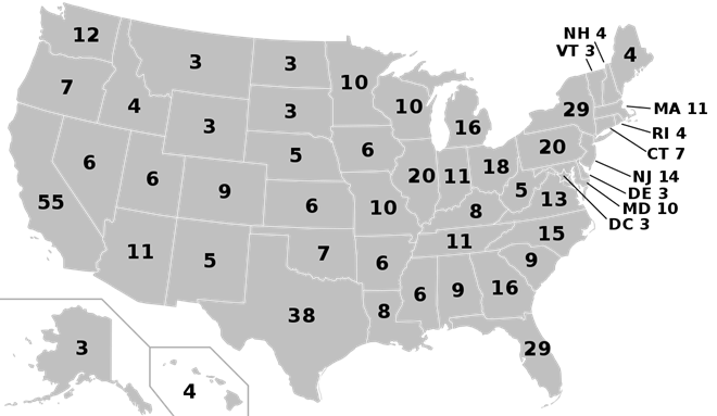 Thủ đô Washington không có nghị sỹ trong Quốc hội nhưng vẫn có 3 phiếu đại cử tri. Bang chiếm nhiều đại cử tri nhất là California với 55, tiếp đó là Texas - 38, New York - 29.