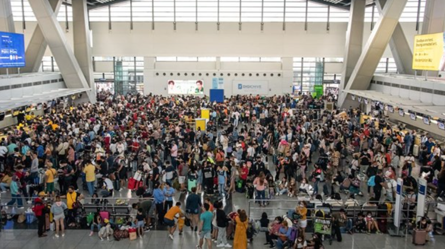 Tình trạng gián đoạn hoạt động khiến nhiều hành khách bị mắc kẹt tại sân bay, tập trung đông đúc tại một số cửa sân bay, xếp hàng đặt lại chuyến bay hoặc ngủ lại ngay tại đây.