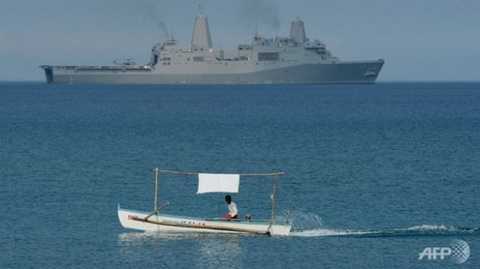 | Một thuyền đánh cá của dân Philippines chạy gần tàu hải quân của Mỹ USS Green Bay (LPD-20) trong cuộc diễn tập chung ở khu vực cách bãi Scarborough 220 km về phía Đông - Ảnh: AFP |