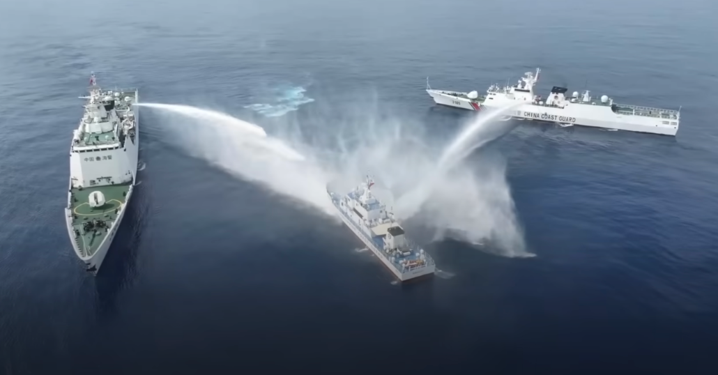 Hình ảnh tàu hải cảnh Trung Quốc phun vòi rồng vào tàu cảnh sát biển Philippines hôm 30/4. (Ảnh: PCG)