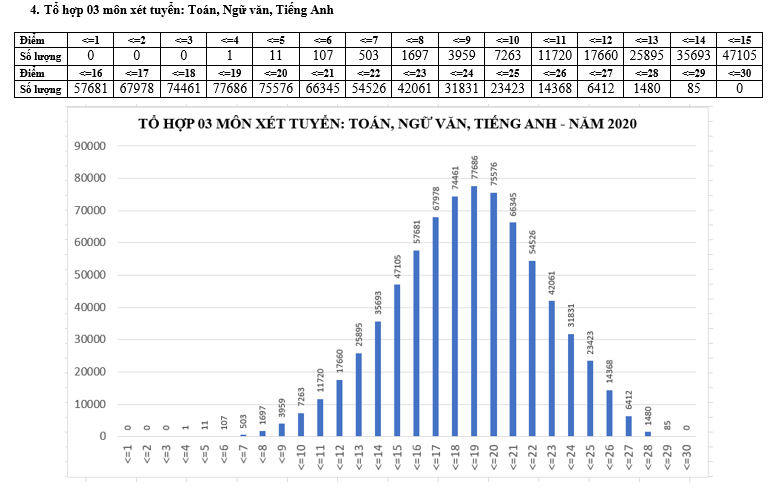 Kết quả phân tích điểm thi theo tổ hợp 03 môn xét tuyển Toán, Ngữ văn, Tiếng Anh cho thấy: Điểm trung bình là 18,19 điểm, điểm trung vị là 18,3 điểm; tổng điểm có nhiều thí sinh đạt nhất là 19 điểm.