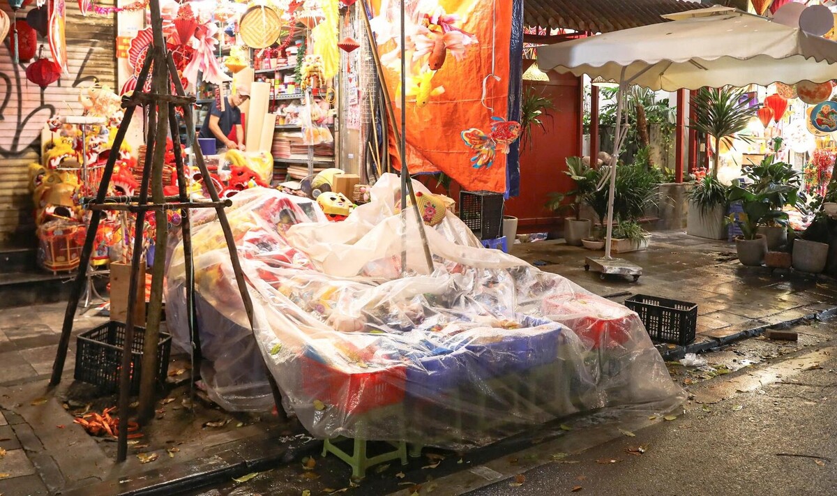 Tối 6/10 (tức 15/8 Âm lịch), do ảnh hưởng của hoàn lưu cơn bão số 11, Hà Nội mưa rả rích từ đầu giờ chiều khiến phố Hàng Mã (Hà Nội) vốn đông đức, rực rỡ sắc màu dịp Tết Trung thu nay vắng vẻ lạ thường.