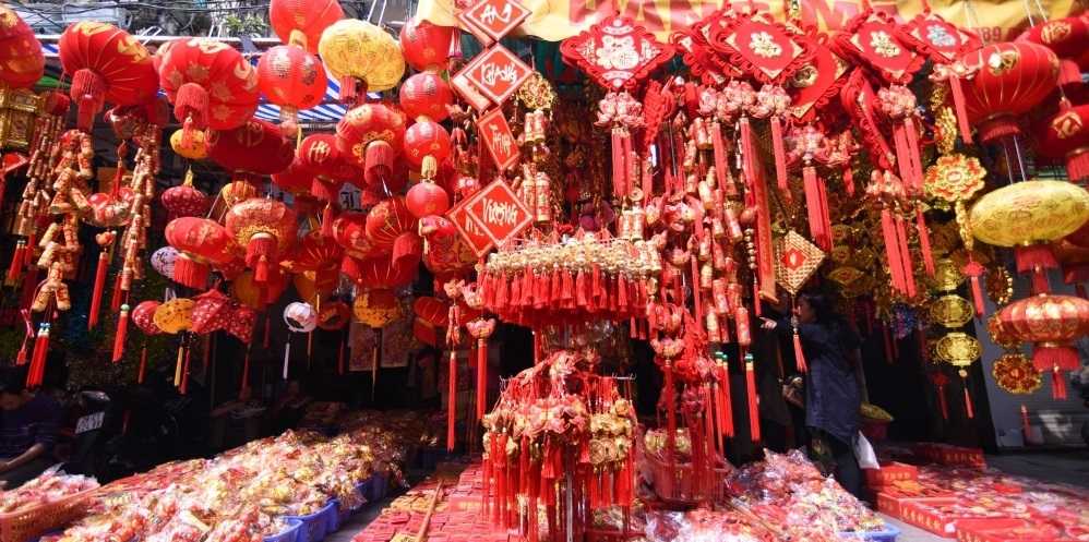 Các tuyến phố Hàng Mã, Hàng Lược, Hàng Rươi của Hà Nội những ngày này đang ngập tràn không khí Tết. Các cửa hàng bày bán nhiều đèn, hoa, đồ trang trí với màu đỏ chủ đạo.