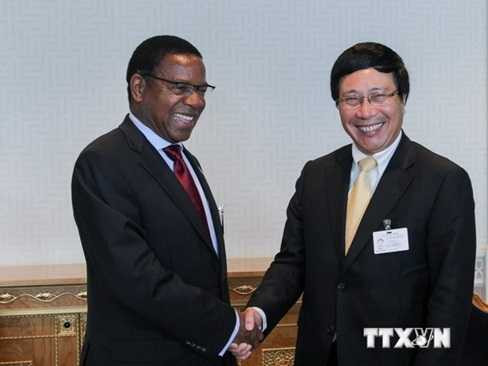 | Phó Thủ tướng Phạm Bình Minh (phải) tiếp Bộ trưởng Ngoại giao Tanzania Bernard Kamillius Membe. (Ảnh: Lê Dương/TTXVN) |