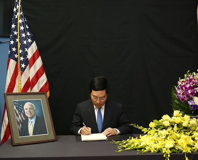 Ghi sổ tang mở tại Đại sứ quán, Phó Thủ tướng Phạm Bình Minh viết: “Đối với Chính phủ và nhân dân Việt Nam, ngài Thượng nghị sỹ John McCain luôn là biểu tượng cho thế hệ nghị sỹ – cựu binh chiến tranh Việt Nam, là người đi đầu và có nhiều đóng góp to lớn trong việc hàn gắn vết thương chiến tranh, bình thường hóa và thúc đẩy quan hệ Đối tác toàn diện Việt Nam-Hoa Kỳ.