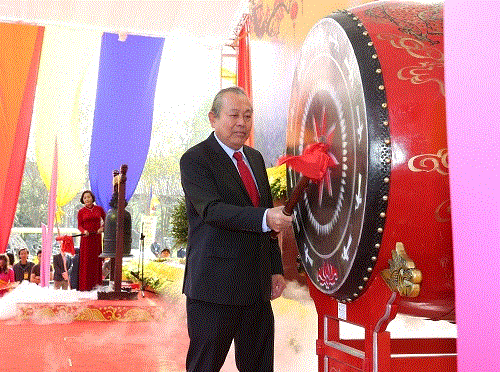 Phó Thủ tướng Trương Hòa Bình đánh trống khai hội chùa Bái Đính. (Ảnh: VGP)