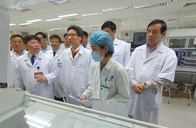 Phó Thủ tướng Vũ Đức Đam kiểm tra hệ thống labo xét nghiệm tại Bệnh viện Bệnh nhiệt đới Trung ương.