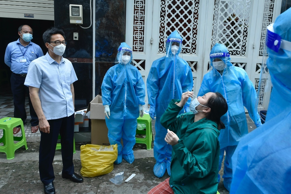 Phó Thủ tướng Vũ Đức Đam yêu cầu đội lấy mẫu xét nghiệm nhanh tại Tổ dân phố 16, khu phố 2, phường Tân Chánh Hiệp, quận 12, hướng dẫn người dân tự lấy mẫu. (Ảnh: Báo Chính phủ)