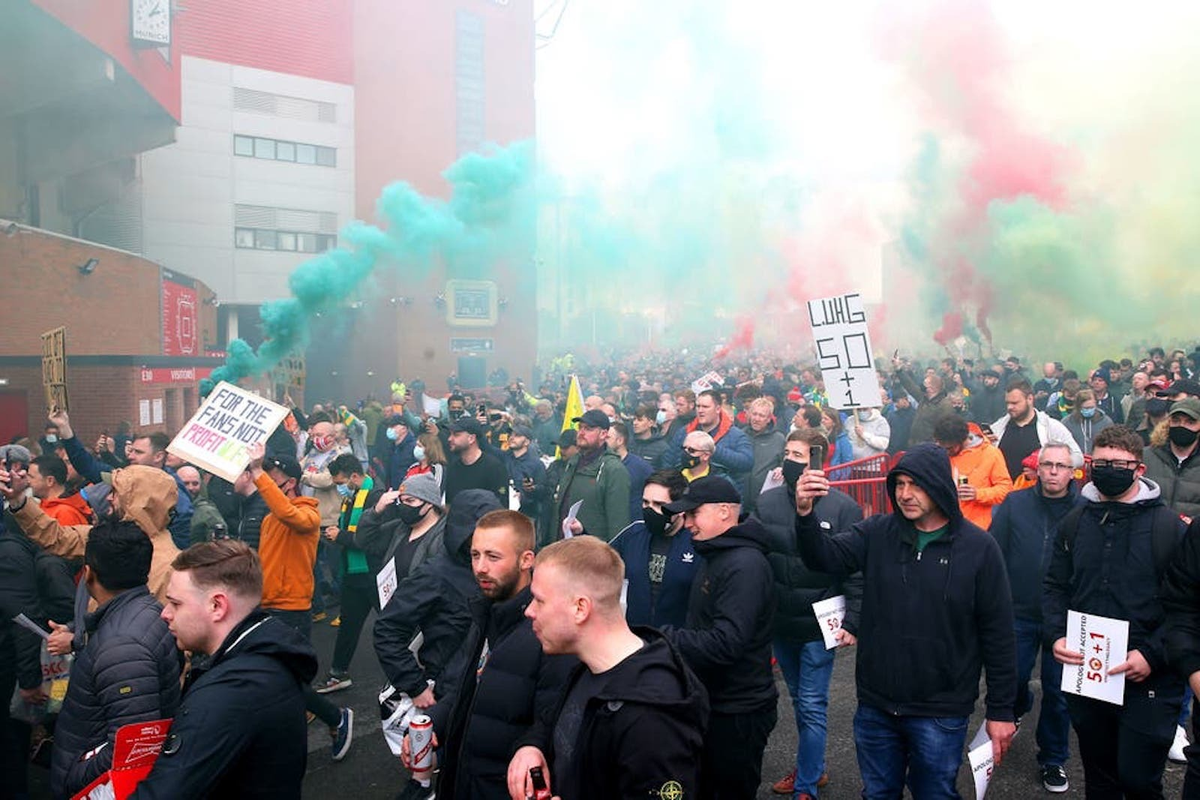 Trước trận gặp Liverpool hồi tháng 5, cổ động viên đã biểu tình để phản đối nhà Glazer - giới chủ của Man Utd khi Quỷ đỏ có tên trong danh sách các đội bóng dự Super League.